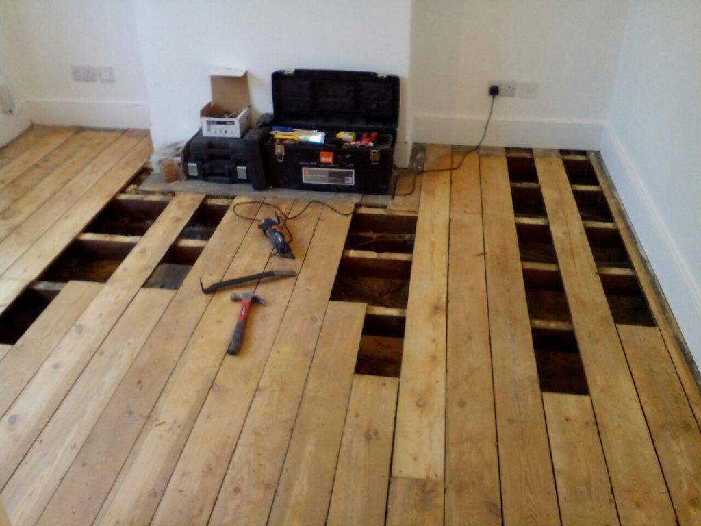 - По окончанию работы, полы подвергают шлифовке, затем щели между досками заливают специальной шпатлевкой.