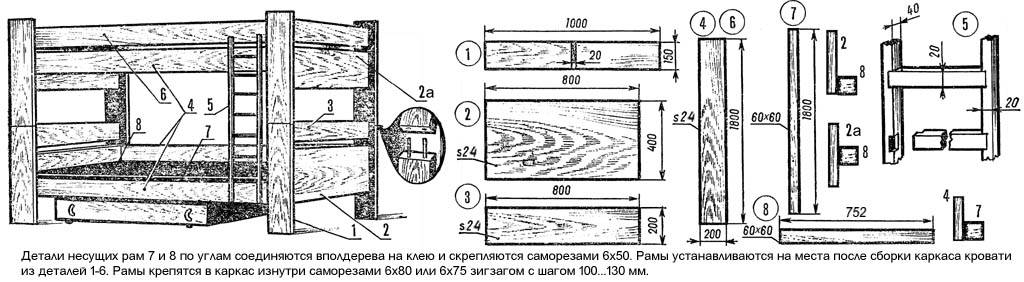 Собирается эта кровать, так сказать, в обратном порядке: дет. 4 и 6 крепятся к дет. 1 саморезами изнутри, а затем с помощью дет. 2, 2а и 3 на шкантах собирается каркас. После этого устанавливаются опорные рамы (дет. 7 и 8) и лестница. Кровать готова, можно класть ложа и спать. Если разъединять эту кровать на две не планируется, то дет. 1 делают удвоенной длины (2000 мм). Тогда разъемное шкантовое соединение (врезка слева на рис.) не нужно, а каркас станет еще прочнее.