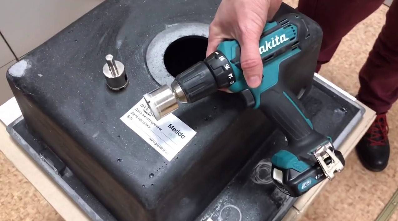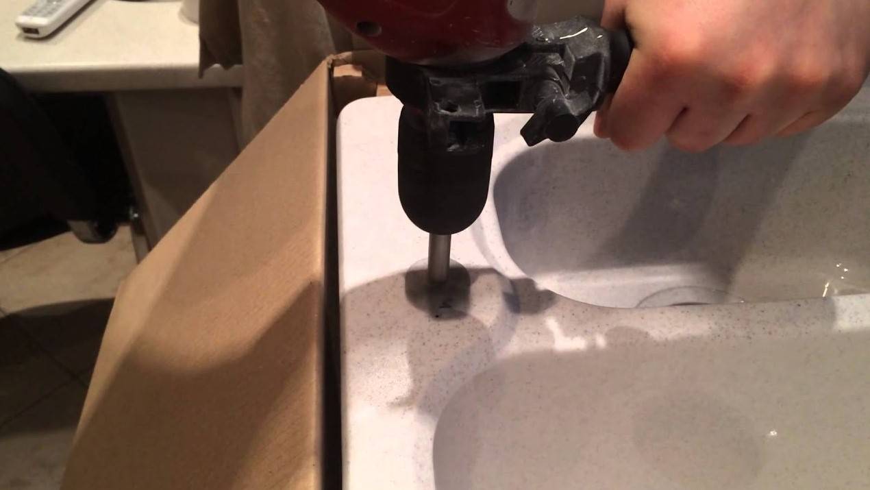 Особенностью раковин из камня является отсутствие отверстия для смесителя. Приходится делать его самому. Конечно, это сразу рождает проблему: нужна электродрель с алмазной насадкой соответствующего диаметра (35 мм).