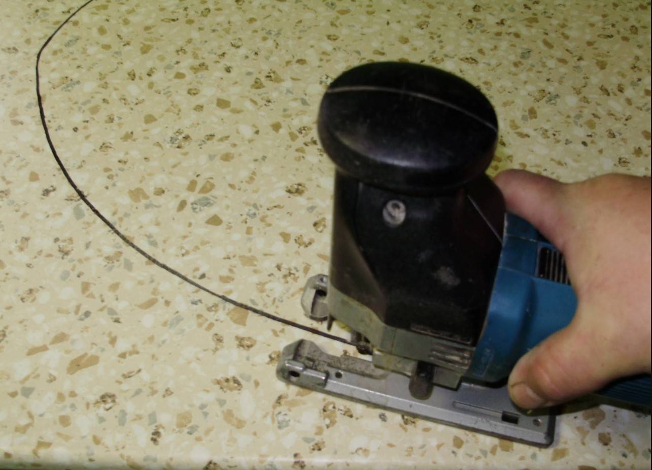 Для того чтобы лобзик мог резать столешницу, надо просверлить в ней начальное отверстие для лезвия лобзика