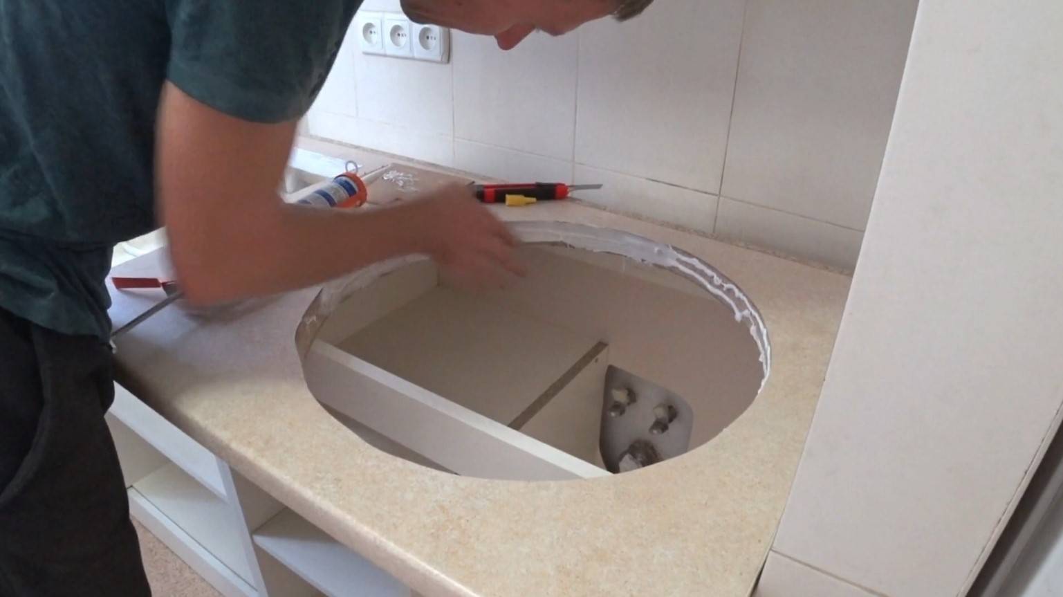 Далее приступают к установке кухонной раковины в нишу, крепко прижав ее края, в результате чего герметик заполняет все пустоты и образует надежную и прочную преграду.