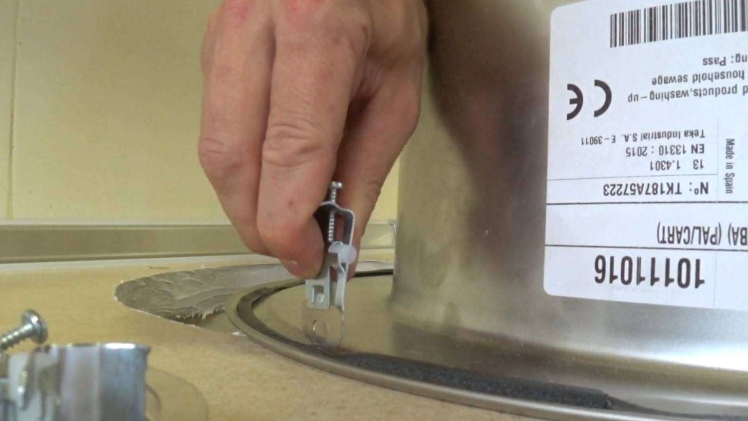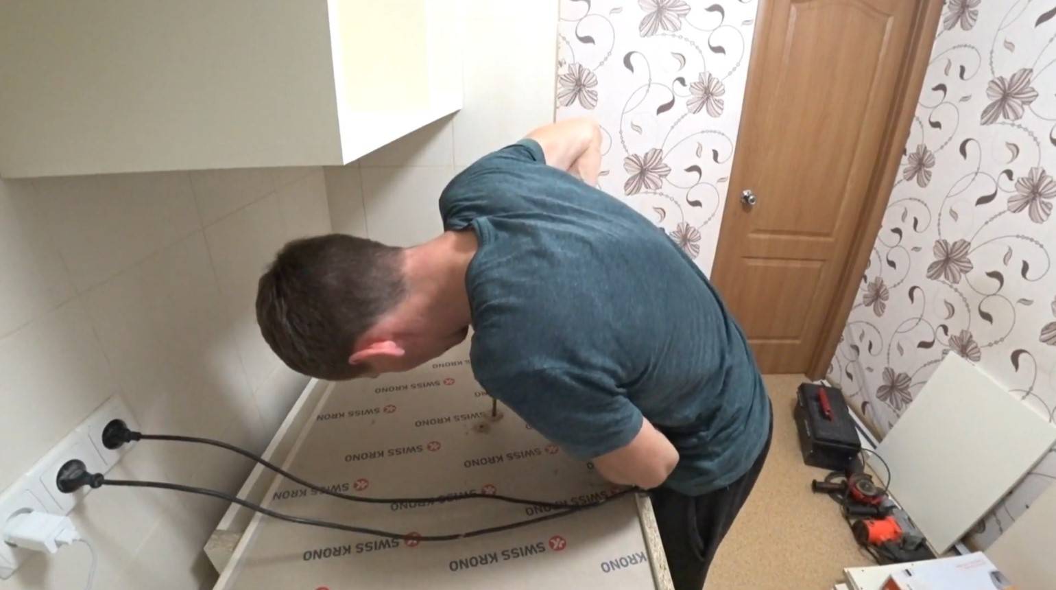 Когда после крепления он выступает за их пределы, его подрезают остро наточенным монтажным ножом. Если такую процедуру не выполнить, выпирающий уплотнитель не позволит креплениям плотно прижать изделие к основанию. Далее поверхность столешницы и полиэтилен обезжиривают, используя тряпку, смоченную в ацетоне или бензине.