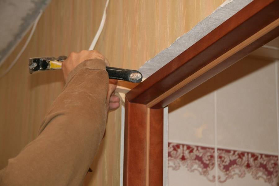Завершающим шагом является установка наличников по бокам и сверху межкомнатной двери. Наличники могут соединяться между собой под углом 45 градусов или под прямым углом. Это зависит от дизайна изделия. Иногда детали продают готового размера или их необходимо опилить. Выполняют запил заусовочной пилой. Соединяют элементы по месту, закрепляют с помощью жидких гвоздей или гвоздями без шляпок, забивая в просверленные отверстия.