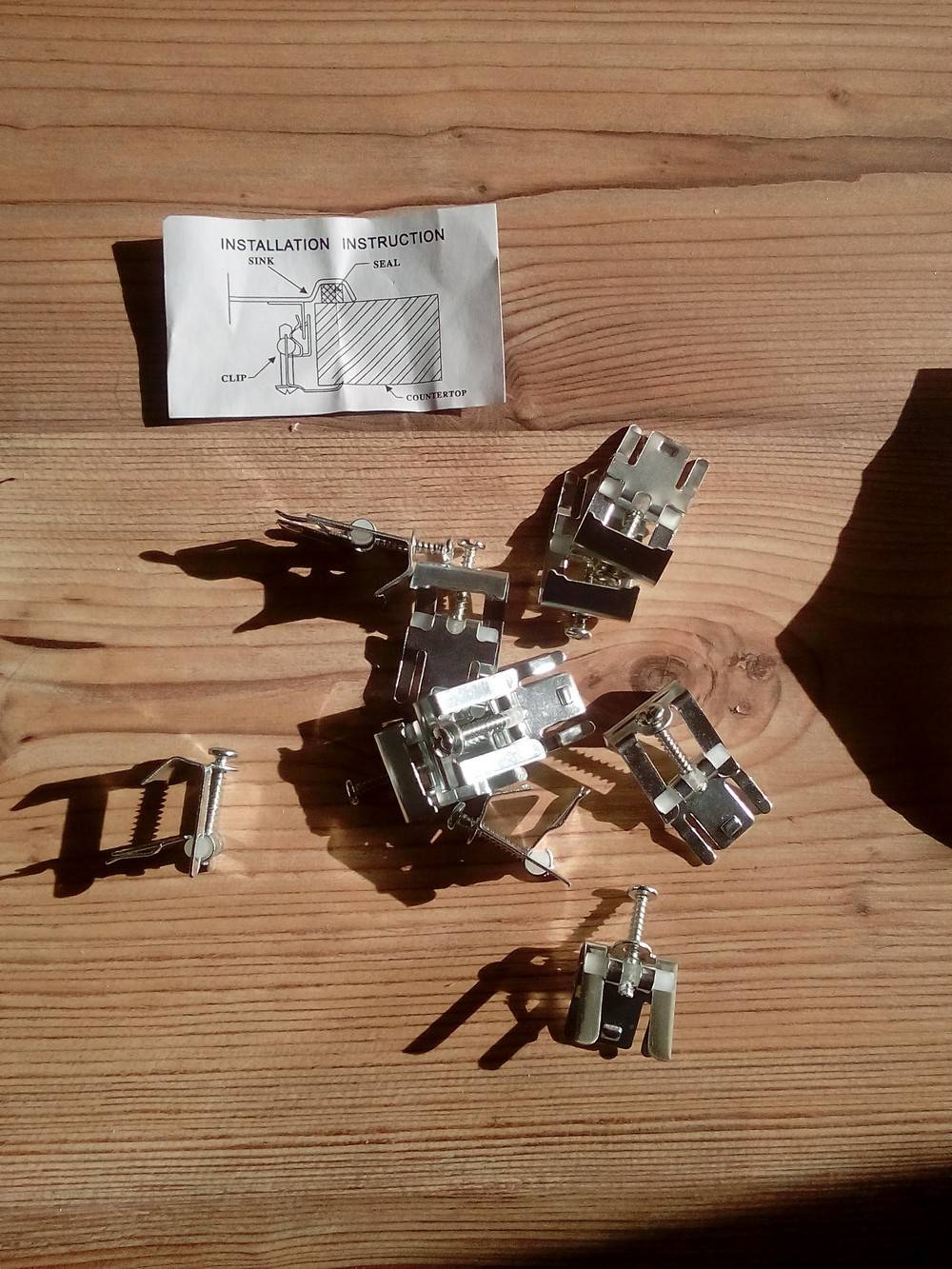 производим монтаж мойки к столешнице с помощью креплений, постепенно