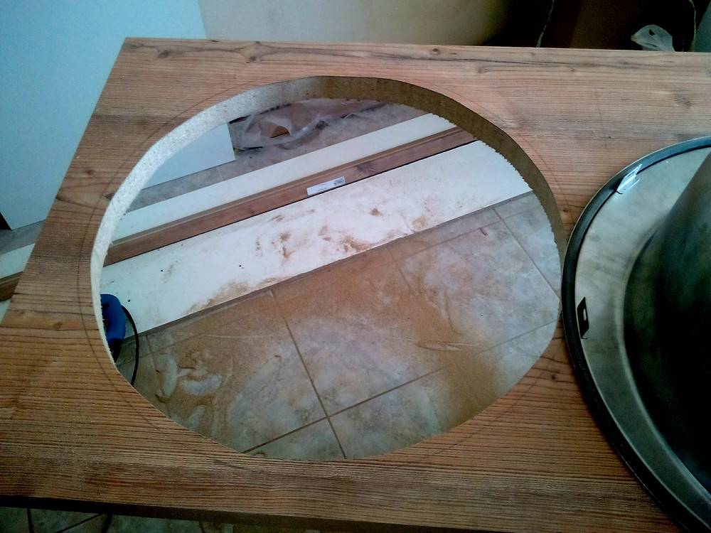 Чтобы точно вырезать промежуток для чаши, прикладываем мойку обратной стороной и используем ее как трафарет. Обводим, получается овал или круг. Убираем чашу, обводим еще раз более жирным следом. Делаем еще один контур на сантиметр глубже. По этому следу и вырезаем. Делаем дырку для лобзика в любом удобном месте, не заходя за контур. Вырезаем окружность. Чтобы обрез получался ровным, используем пилки с прямым зубом. Чтобы выпиленный овал не проваливался, закрепляем его снизу обычными саморезами.