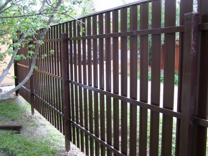 При монтаже внахлест, вплотную или шахматкой расчетный вес забора из металлического штакетника увеличивается. И если он крепится не на фундамент с кирпичными колоннами, лучше немного укоротить межстолбовой шаг.