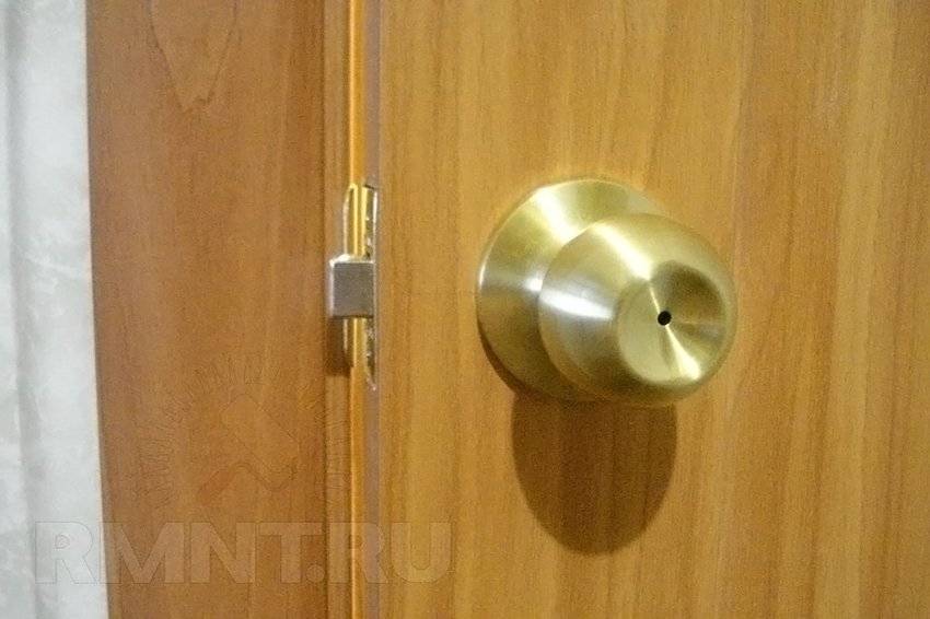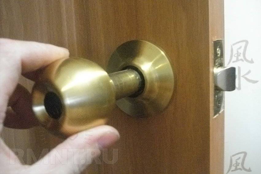 Монтаж изделия на межкомнатную дверь выполняется на правую или левую сторону. Для моделей с круглой рукоятью нужно только перевернуть конструкцию защелки. Язычок при этом должен смотреть в сторону закрывания межкомнатной двери. Если приспособление несимметрично, элементы нужно просто поменять местами, ориентируясь на сторону открывания.