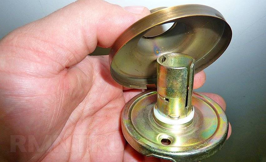 - Надеваем декоративную накладку и корпус ручки-защелки. При этом необходимо надавить на внутренний язычок ключиком или другим подходящим предметом.
