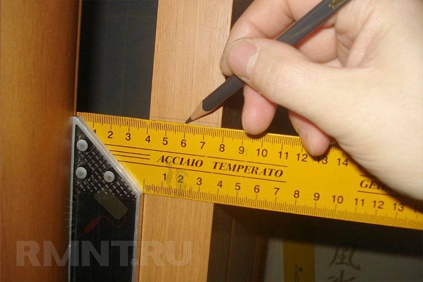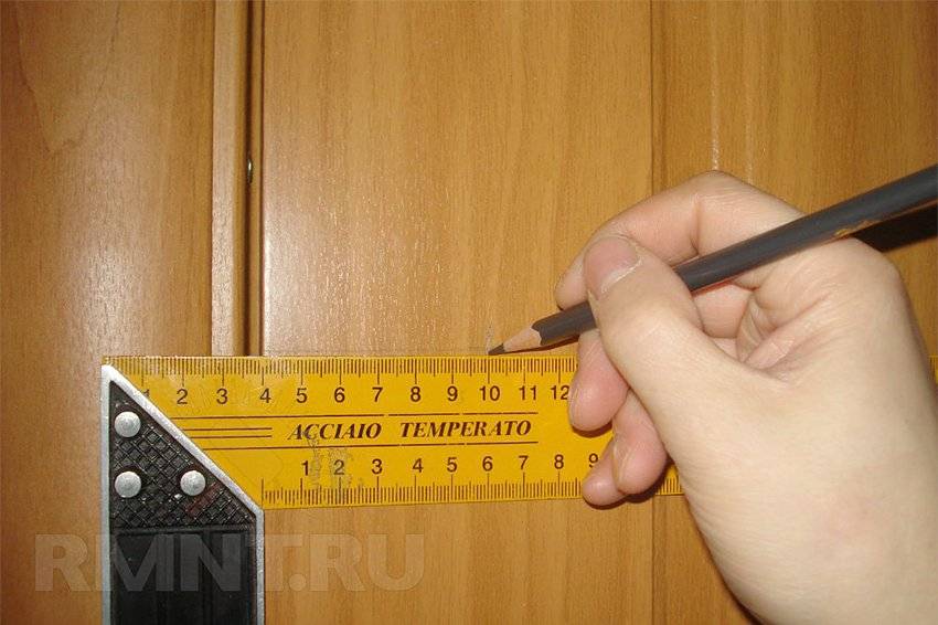 Важным условием для монтажа с первого раза и сохранности дверного полотна является правильная разметка. Здесь актуальна поговорка «семь раз отмерь — один раз отрежь». Отмерьте необходимую высоту механизма от пола (рекомендуется располагать его на высоте 80-100 сантиметров). Для разметки можете использовать кондуктор, а можете обойтись классическими угловой линейкой и карандашом.