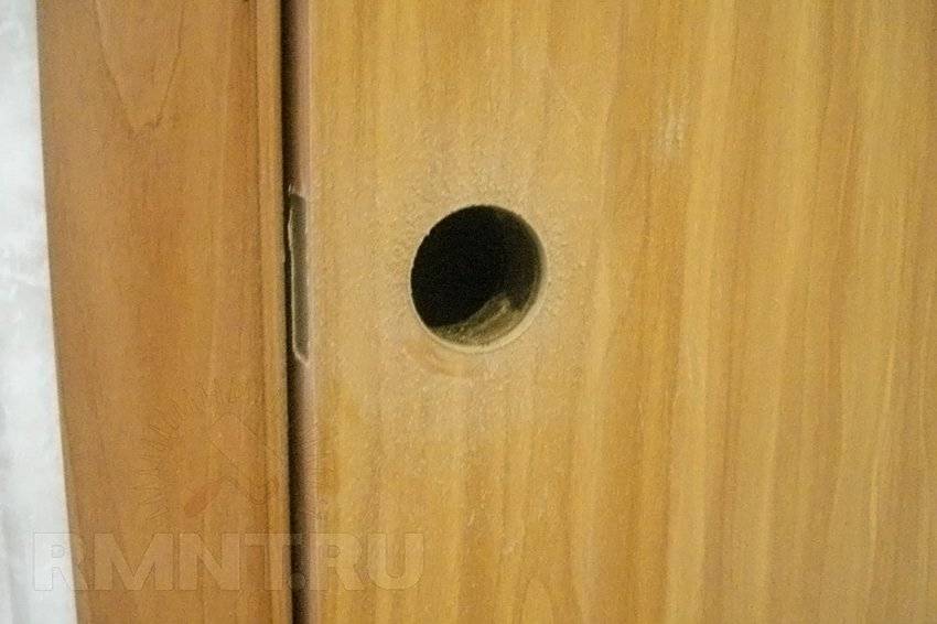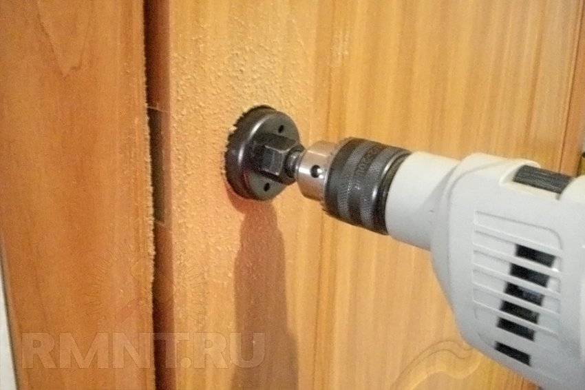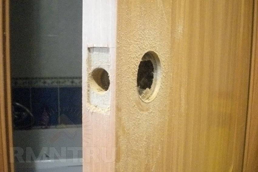 - Этап третий. Сверлом измеряем в длину защелку и далее заглубляем перо в полотно межкомнатной двери на необходимую глубину.