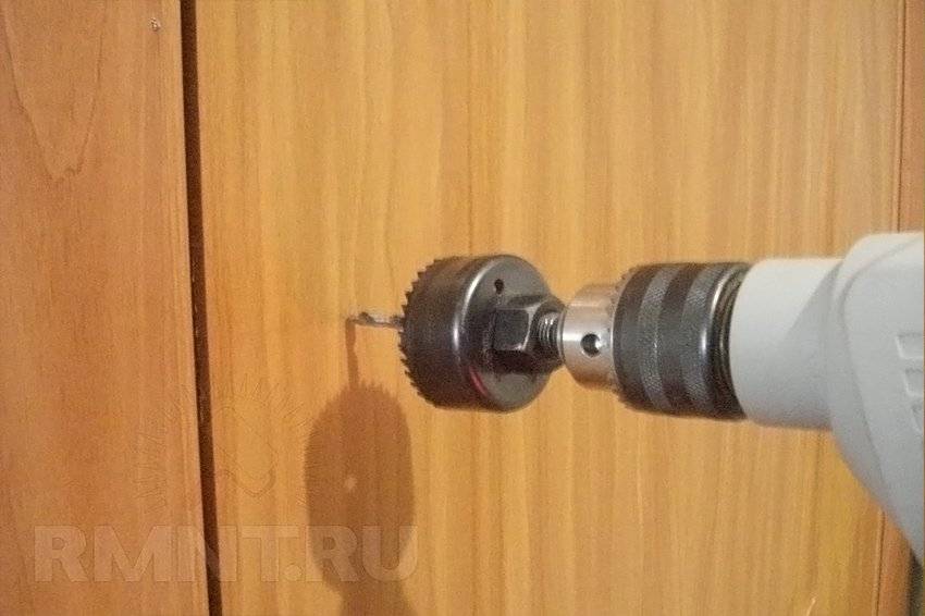 - Берем дрель, устанавливаем перьевое сверло. Его диаметр должен соответствовать толщине запорного устройства, глубина высверливаемого отверстия — его длине.