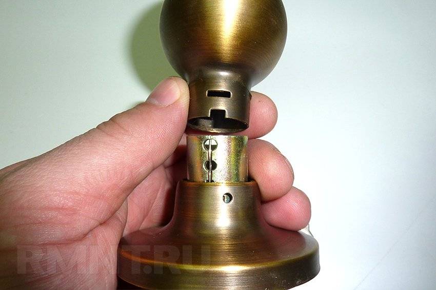 - Устанавливают рукоятку. Стержень и стяжные втулки должны точно войти в пазы механизма защелки. Операция выполняется согласно схеме замка с ручкой.