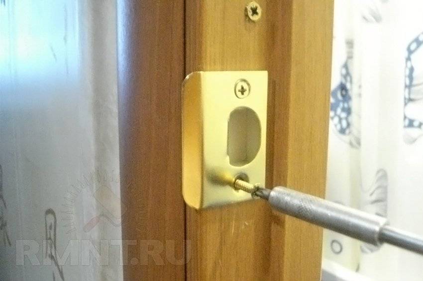 - Поверх отверстия под язык защелки прикручиваем металлическую накладку. На этом этапе установка ручки завершается.