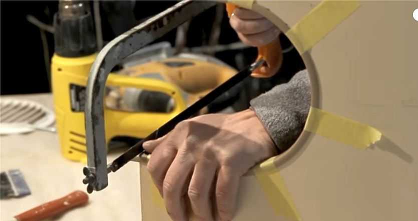 Затем вытяжку надо установить на шкаф, и сделать разметку её основания. Чтобы отпилить отверстие под вытяжку в шкафу, подойдёт электролобзик. Сначала потребуется дрелью сделать маленькие отверстия, а затем уже выпиливать размеченную форму. Так Вы сможете сохранить шкаф, предотвратив его от повреждения при резке.
