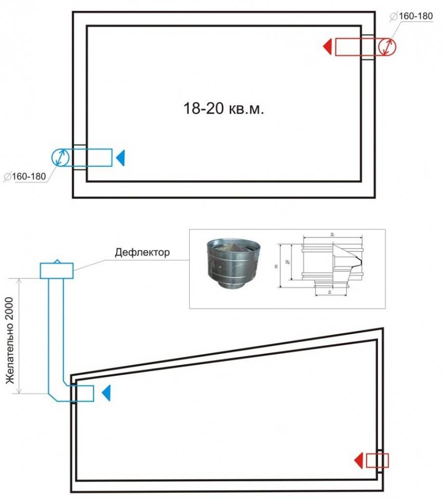 Оптимальное расположение вытяжной трубы – у потолка. Вторая должна размещаться внизу на уровне 500-600 мм от пола. Малое сечение использовать нежелательно.
