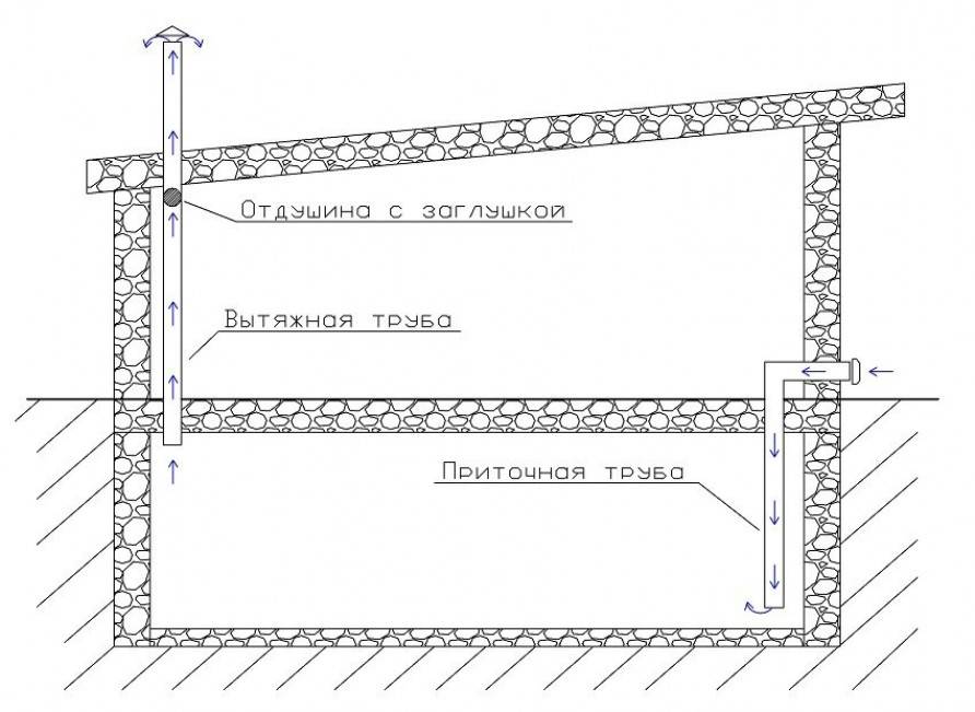 Для обеспечения нормального воздухопритока необходимо монтировать 2 трубы. С помощью приточной воздушные массы станут проникать внутрь, а с помощью другой выходить наружу.