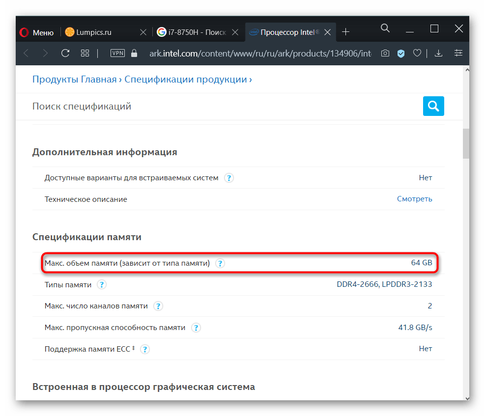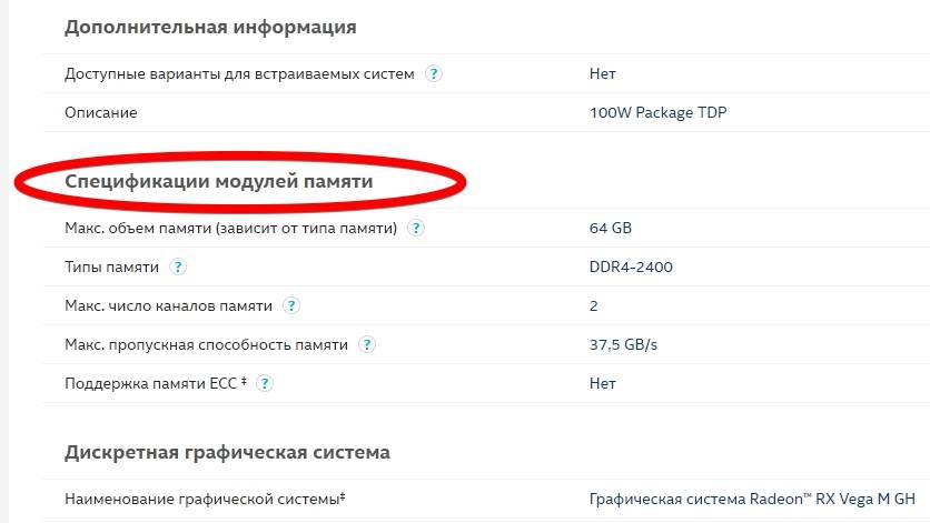 Эту теорию подтверждает и просмотр официальной спецификации модели процессора, установленной в том же ноутбуке, где предельно допустимым объемом указаны 64 ГБ: