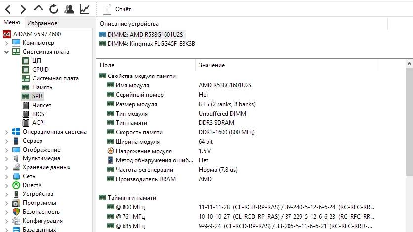 В AIDA64 есть и другой способ, позволяющий увидеть сразу таковые частоты всех планок ОЗУ, встроенных в компьютер. Суть его в следующем: