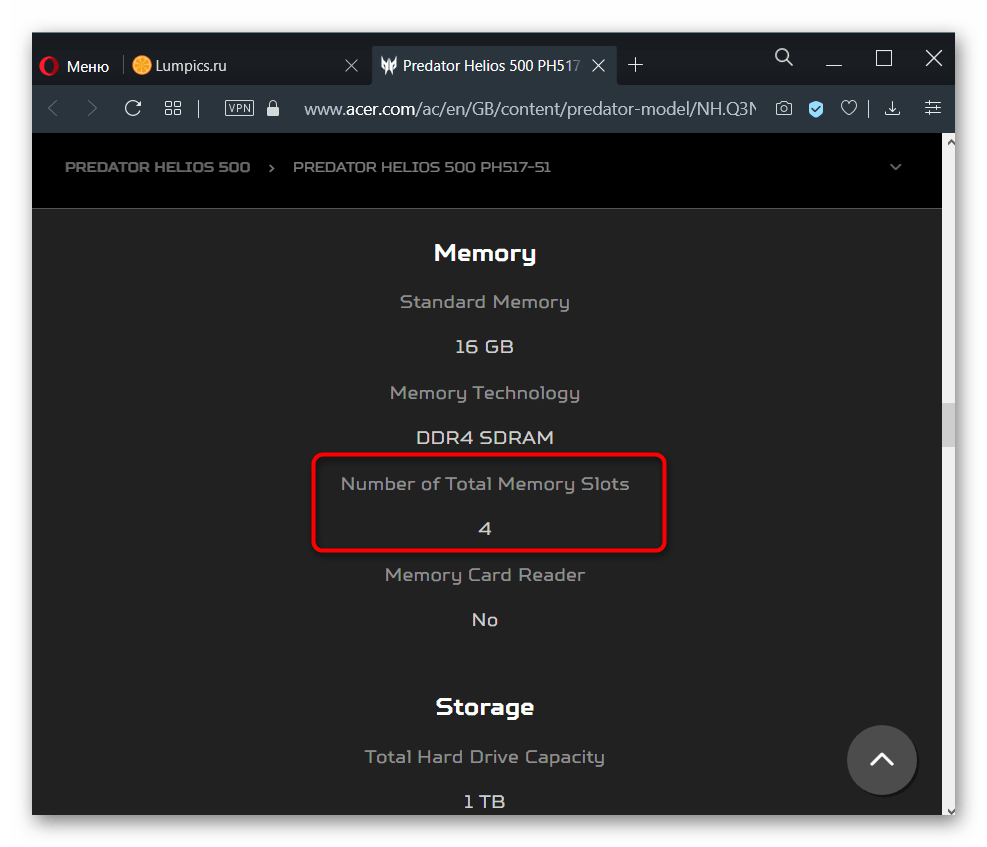 Где-то можно найти лишь количество доступных слотов, и обычно, если умножить объем одного заполненного слота (на примере ниже это 16 ГБ) на количество всех слотов RAM (на скриншоте их 4), можно получить максимально поддерживаемый объем ноутбуком (в данном случае это 64 ГБ).