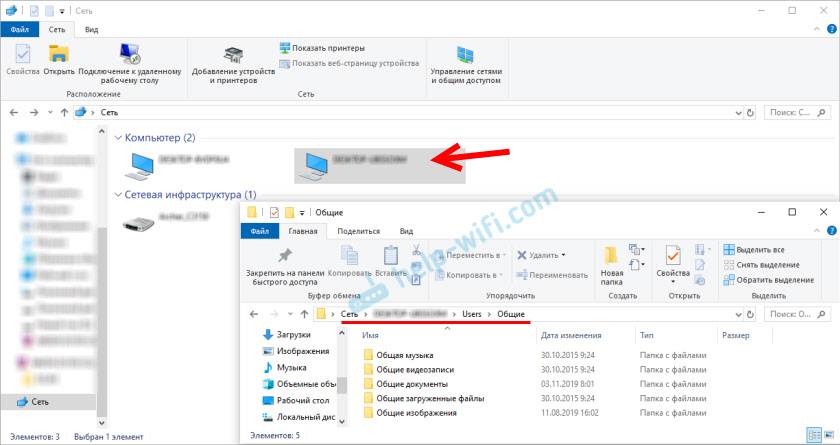 После настройки общего доступа мы можем получить доступ к общим папкам с других компьютеров, которые находятся в одной сети (подключены через один роутер или свитч).