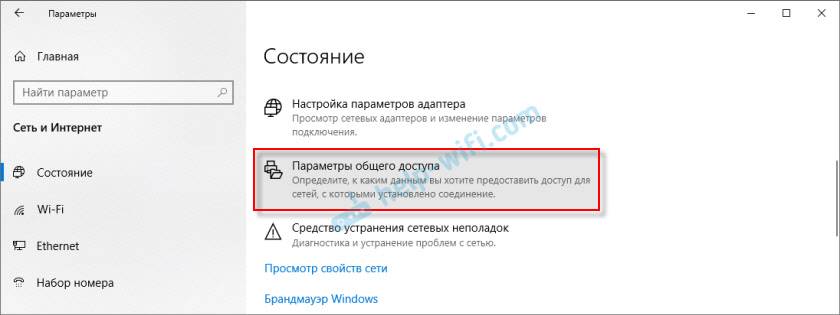 - Затем вернитесь в раздел Сеть и Интернет – Состояние. Нажмите Параметры общего доступа.
