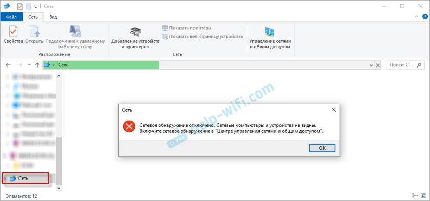Можно сразу перейти в проводник, на вкладку “Сеть”. Если сетевое обнаружение на этом компьютере отключено, то вы увидите сообщение: “Сетевое обнаружение отключено. Сетевые компьютеры и устройства не видны”.