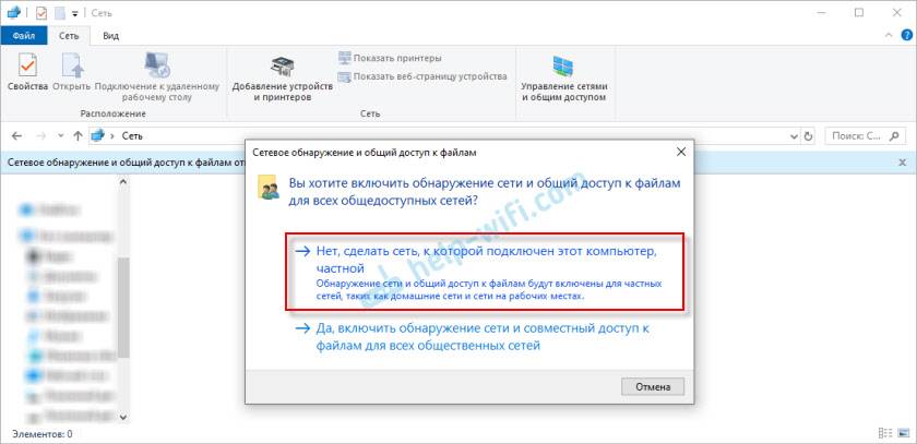 А если сети, к которой вы подключены присвоен статус “Общедоступные”, то появится еще одно окно. Выберите следующий пункт: “Нет, сделать сеть, к которой подключен этот компьютер, частной”.