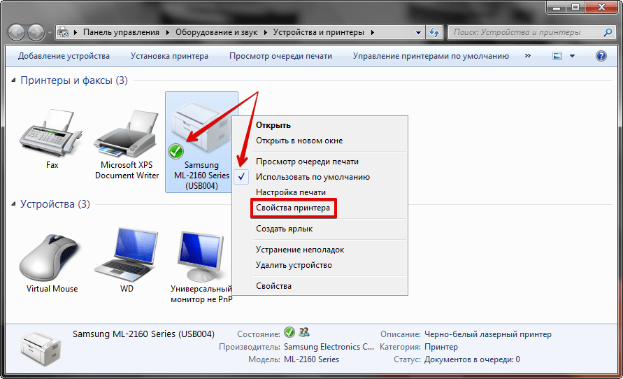 Убеждаемся, что принтер установлен для использования по умолчанию. Устройство будет отмечено зеленой галочкой, а в контекстном меню она появится напротив соответствующего пункта. Открываем свойства, чтобы перейти к детальной настройке.