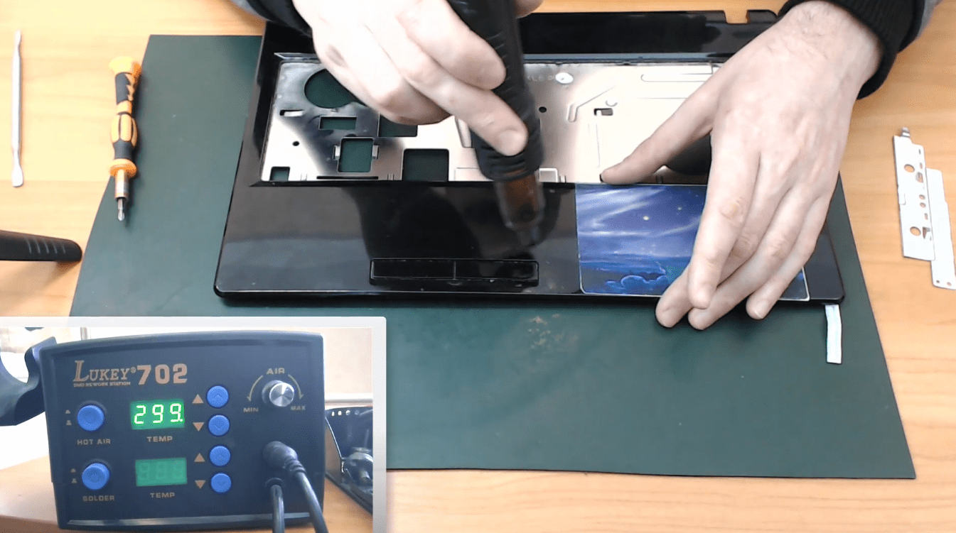 Чтобы старый тач беспроблемно отошел от пластика, следует нагреть его при помощи технического фена. Нагрев осуществляется прямым потоком воздуха. Также можно попытаться отодрать микросхему тачпада при помощи металлической лопатки. Этот вариант может стать хорошим решением, если изделие посажено на небольшое количество клея.