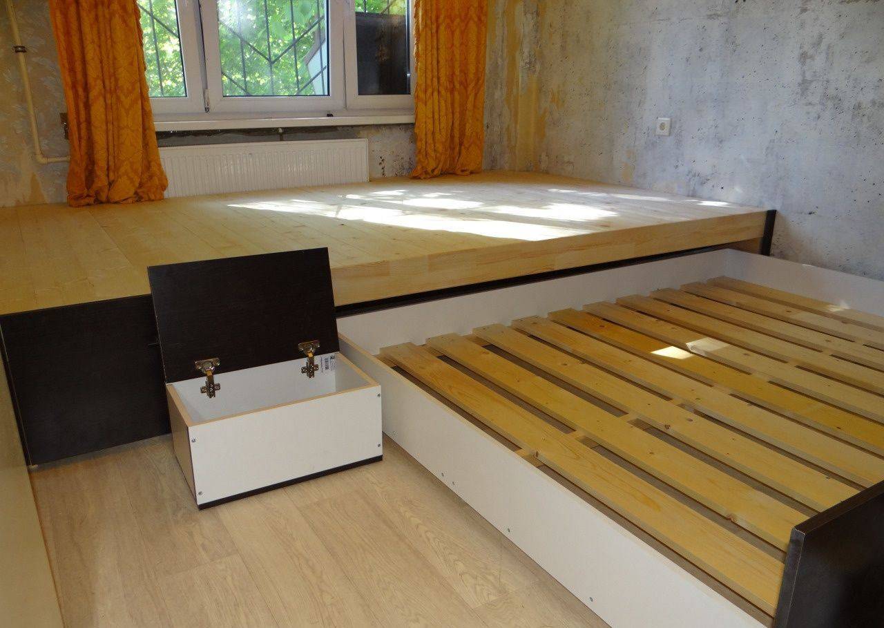 Изготовить чертежи и схемы, выбрать размеры, создать проекты и эскизы кровати-подиума, можно своими руками. Чтобы сделать конструкцию, выбирают материалы, инструменты, собирают каркас, обшивают его, делают выкатную полку-кроватку. Для стандартной комнаты площадью не менее 15 кв. м., высотой потолка 2,5-2,9 метра, высота подиума составляет 45-55 см. Спальное место в описываемой модели выкатывается на колесиках-роликах.