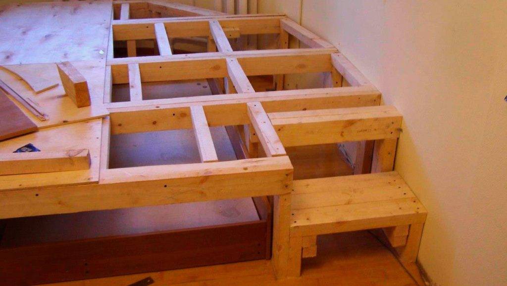 Далее собирают решетку из реек, на которой будет лежать матрас. Конструкцию лакируют, высушивают, устанавливают на ножки. К каркасу, при помощи шуруповерта, крепят фасад кроватки, прикручивают колесики. Для высоких подиумов делают ступеньки. Верхнюю поверхность шлифуют, красят, декорируют ковролином, ламинатом, натуральным шпоном.