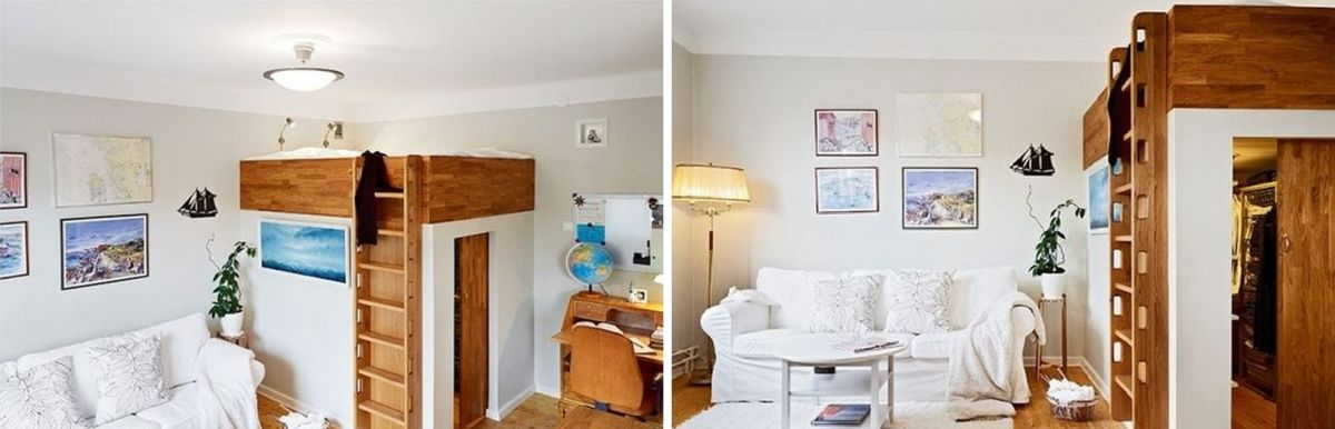 Все это неплохо, но стоит знать и о недостатках. Во-первых, решения недешевые. Трансформируемая мебель стоит немало, как и изготовление подиума с достаточной несущей способностью. Во-вторых, каждый вечер и каждое утро, чтобы добыть и спрятать спальное место, придется совершать определенные телодвижения. Это только вначале кажется необременительным. На деле же довольно быстро надоедает…пока не превратиться в привычку.