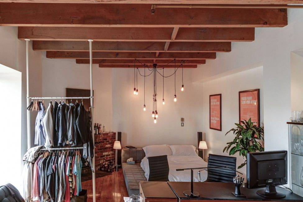 Кроме стен, помочь разделить пространство может оформление потолка, покрытия пола, организация системы освещения. Для зоны гостиной должен быть предусмотрен более яркий свет, чем для спального места.