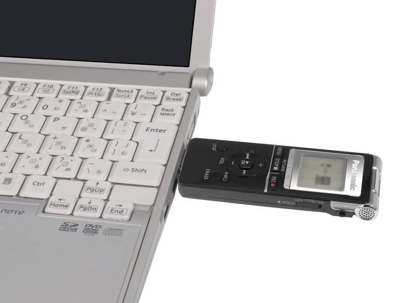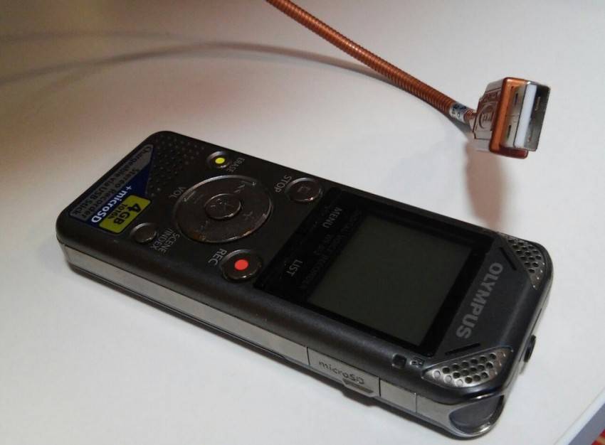 - Сопряжение с компьютером через USB интерфейс, которое позволяет не только использовать память диктофона для данных, но и как флеш – накопитель. Также через кабель USB происходит подзарядка батареи.