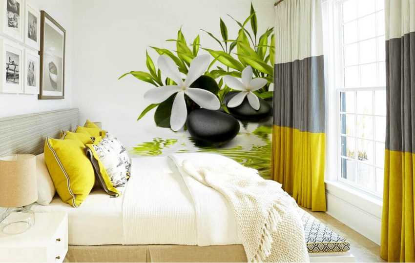 Сочетание обоев с фотообоями в желтой цветовой гамме будет гармонично смотреться, если вы подберете для стен светло-бежевые, нежно-голубые, светло-зеленые, блекло-розовые оттенки. Белый и желтый цвета также будут гармоничны.