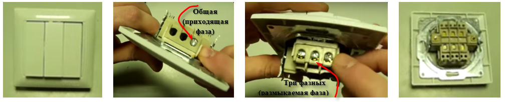 Последовательность действий при подключении трёхклавишного выключателя следующая: