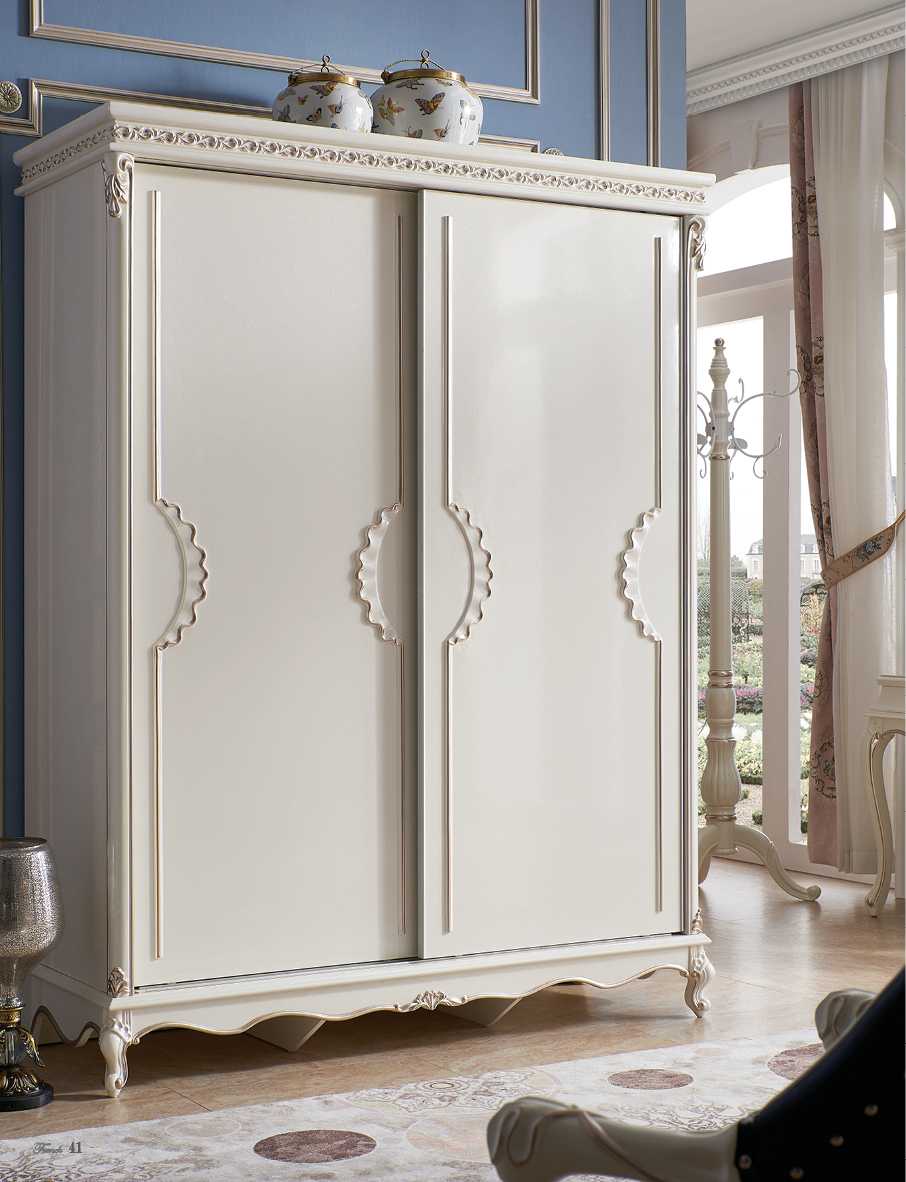 - Классика. Прямые строгие контуры смягчаются срезанными и скругленными углами. Мебель в основном из древесины теплых тонов. Из декора позволяются зеркала, перфорация створок по контуру и вставки из фарфора с росписью. Подойдет серый, белый, нежный зеленый и вся гамма коричневых;