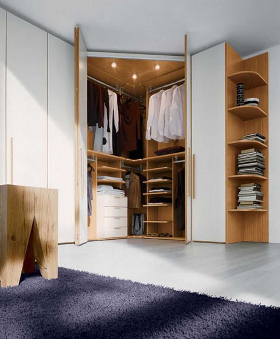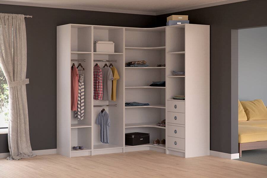 - Угловые. Имеют Г-образную форму, позволяющую экономить пространство. Отлично подходят для небольших комнат. Используются для хранения одежды, обуви, аксессуаров. Размещаются в спальне, прихожей. Часто изготавливаются на заказ, поэтому адаптировать конструкцию можно под любое помещение.