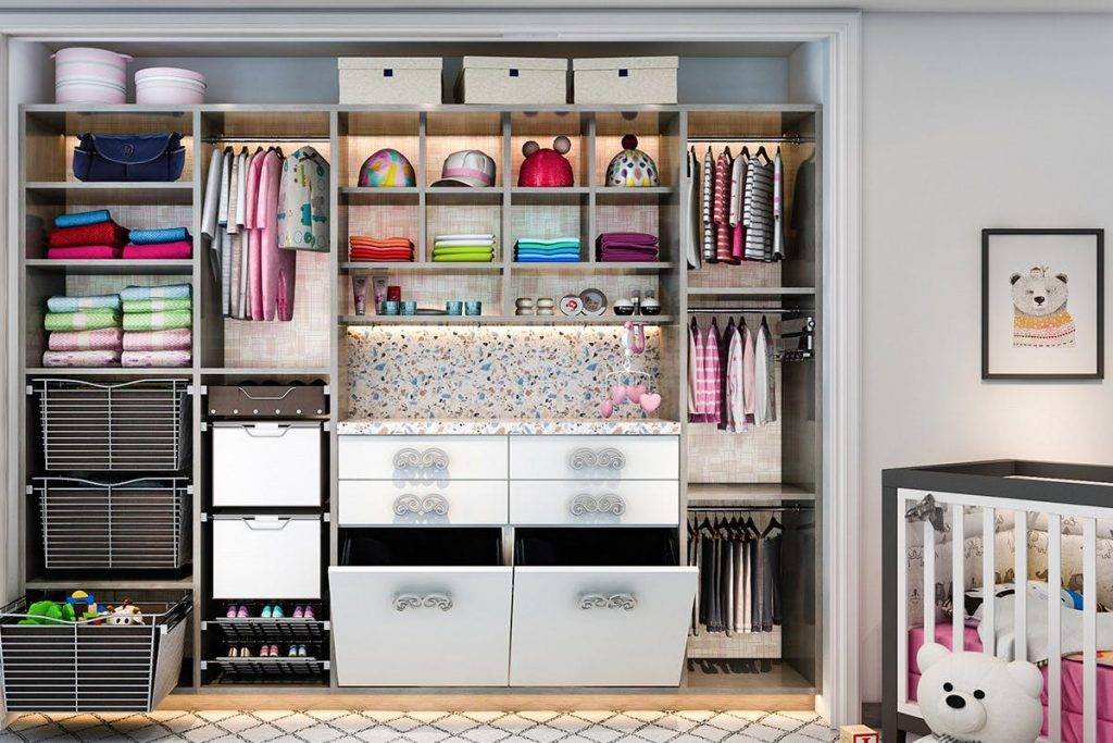 Детская комната — это отдельный мир, в котором все должно быть удобно, поэтому конструкторы гардеробных стараются создавать мебель, максимально комфортную для ребенка или подростка. Шкаф, устанавливаемый в детскую комнату, может иметь много открытых модулей, в которых разместятся не только аксессуары или головные уборы, но и игрушки или книги. Еще одна особенность такой мебели — это максимальная безопасность в эксплуатации, поэтому производители: