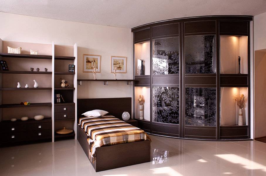 В спальную следует подбирать более вместительный шкаф стенка в комнату, который будет больше походить на целую гардеробную комнату. Обычно, центром спальни служит кровать, визуально дополняет которую тот самый большой шкаф.
