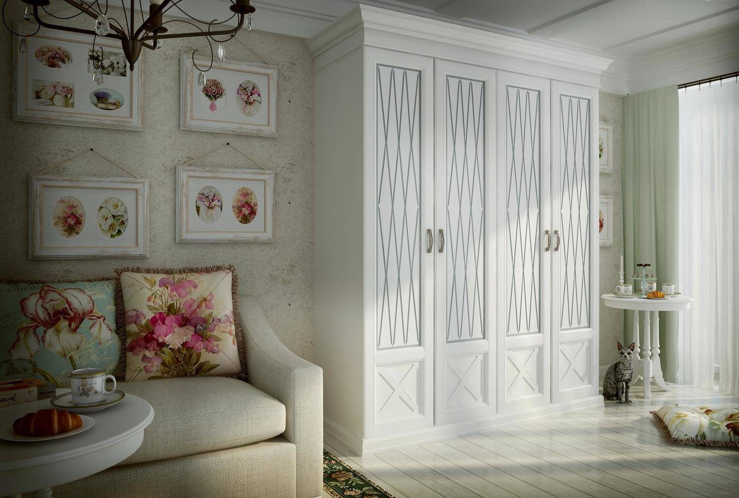 - Прованс. Шкаф в этом стиле должен быть аккуратным и светлым. Фасады глухие или стеклянные. Обязательно наличие изогнутых ножек, резьбы, кованых ручек.