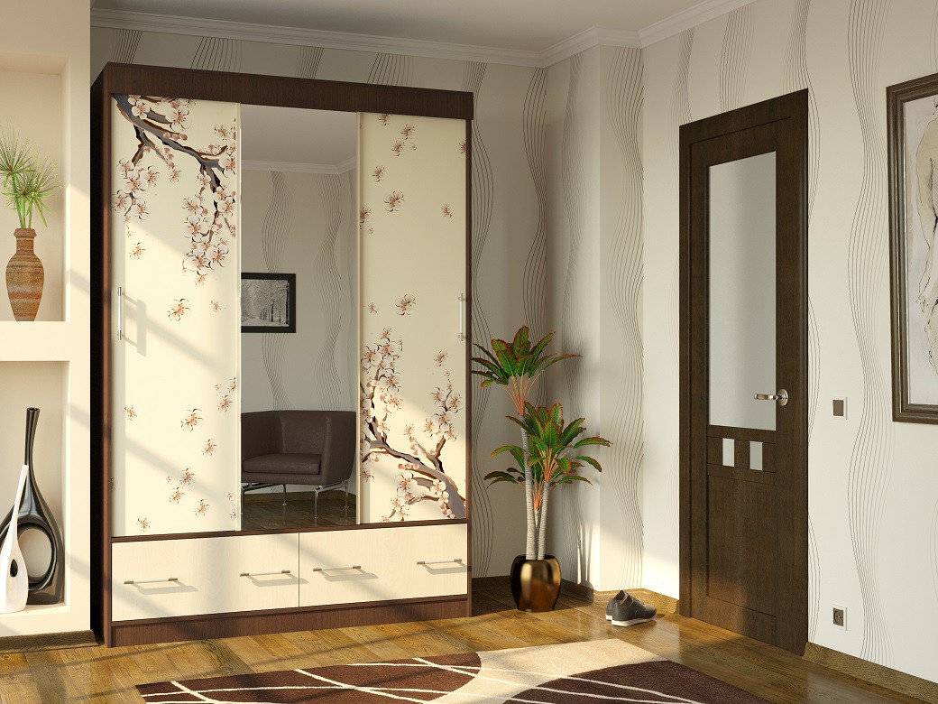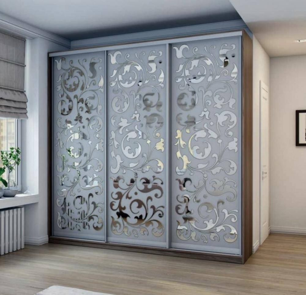 Фасады современных шкафов принято украшать. Для зеркальных и стеклянных поверхностей подойдут пескоструйные узоры или фотопечать. Можно выбрать рисунки различных стилей и направлений. Они легко наносятся, готовые поверхности неприхотливы в уходе.
