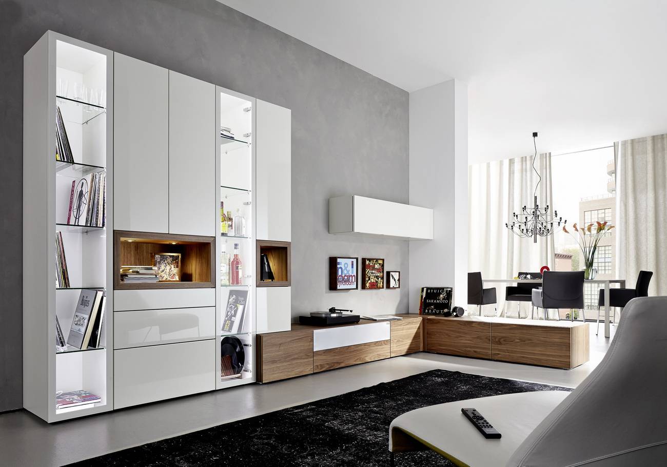- Модульные. Состоят из нескольких секций, схожих по стилю, цвету, материалу. Их можно комбинировать, соединять или размещать отдельно в разных частях комнаты. Такая система является мобильной, функциональной, позволяет выгодно обыграть пространство помещения.
