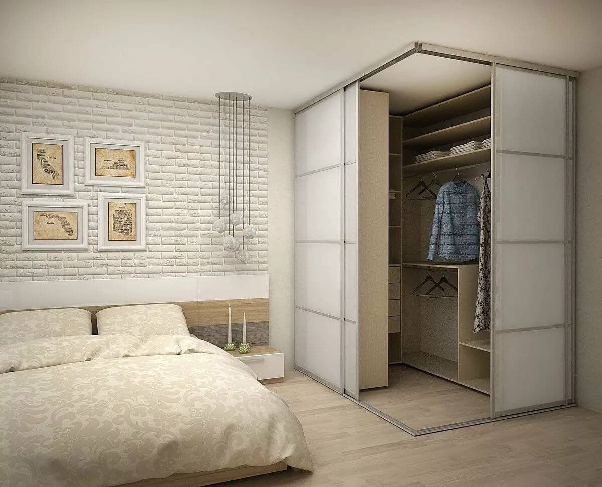 Фасад углового шкафа в спальне выполняется в нескольких вариантах: