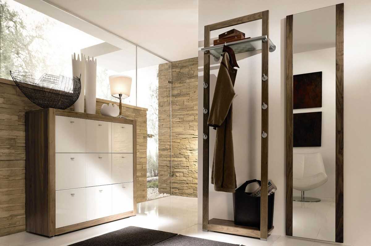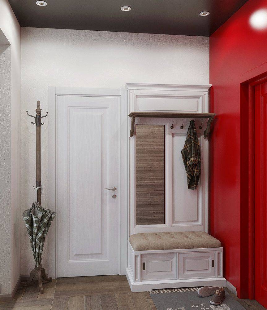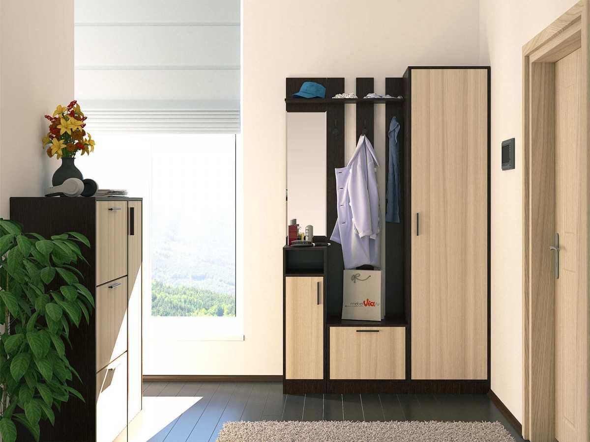В прихожей не должно быть громоздкой мебели. Для размещения одежды можно использовать шкаф глубиной не более 45 см. В маленьком помещении удобно использовать шкаф-купе, так как в нём открывают створки, сдвигая их вбок. В маленьких прихожих можно использовать угловые шкафы.