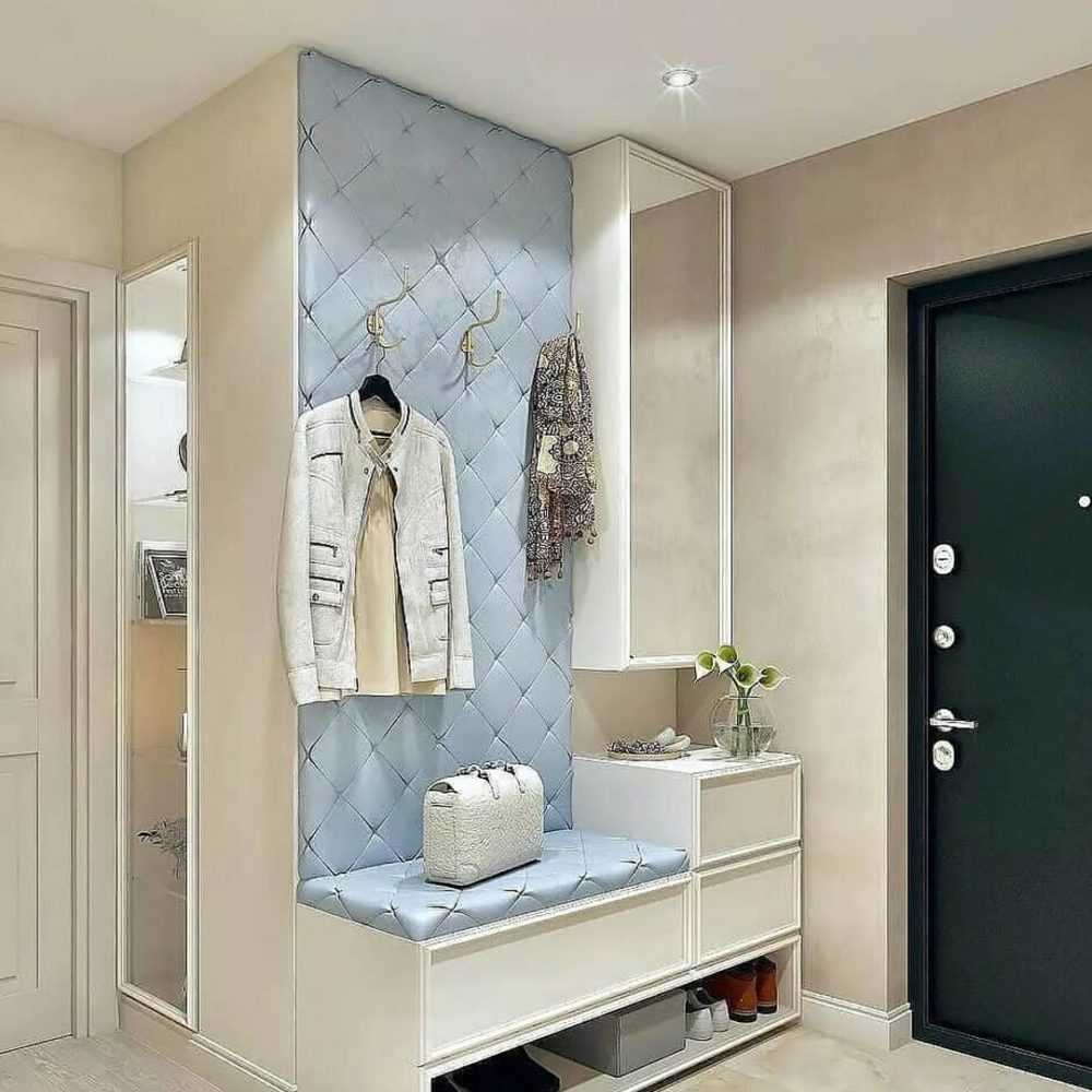 При наличии возможности в квадратной прихожей располагают не только шкафы, но и обувницы с сиденьем, а также открытые вешалки. Если есть возможность, удобно использовать встроенную мебель.