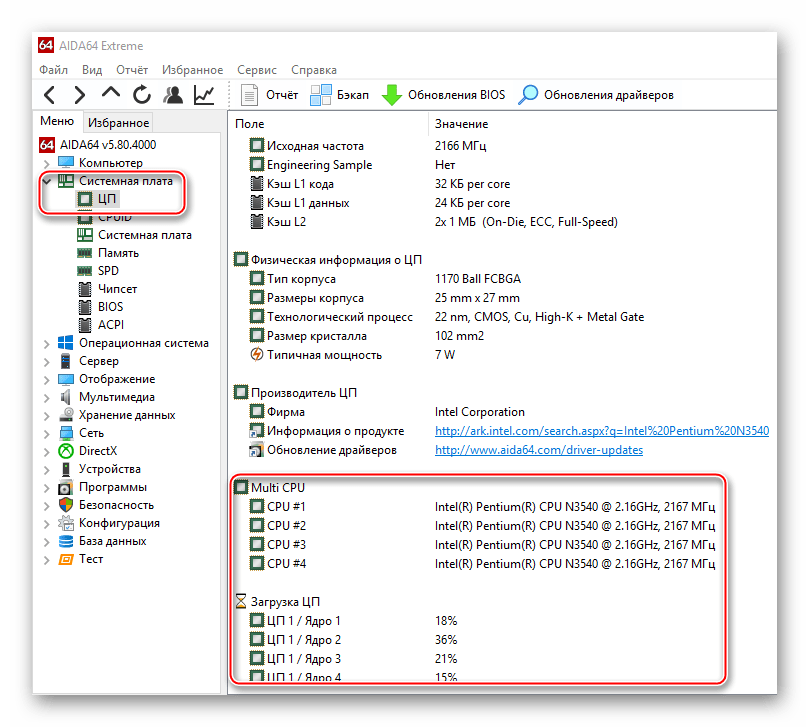 Количество ядер процессора Everest определяется через вкладку «Меню» в левой части окна. Затем выбираются позиции «Системная плата» и «ЦП». В правом окне под позицией «Multi CPU» указаны все ядра процессора и характеристики каждого.