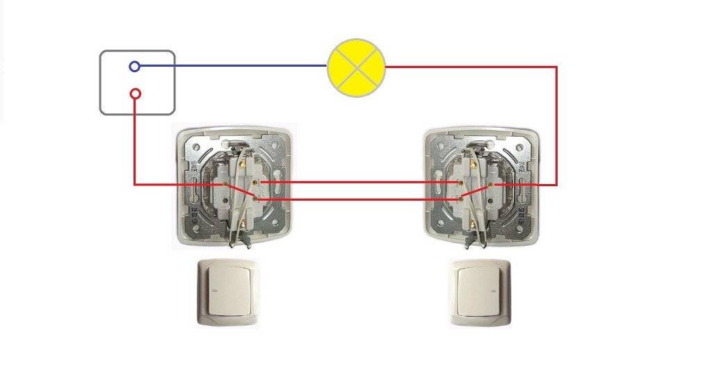 Независимо от положения клавиш на двух коммутаторах, цепочка питания будет замыкаться или размыкаться. Поэтому включить светильник получится с каждой точки, как собственно и выключить.