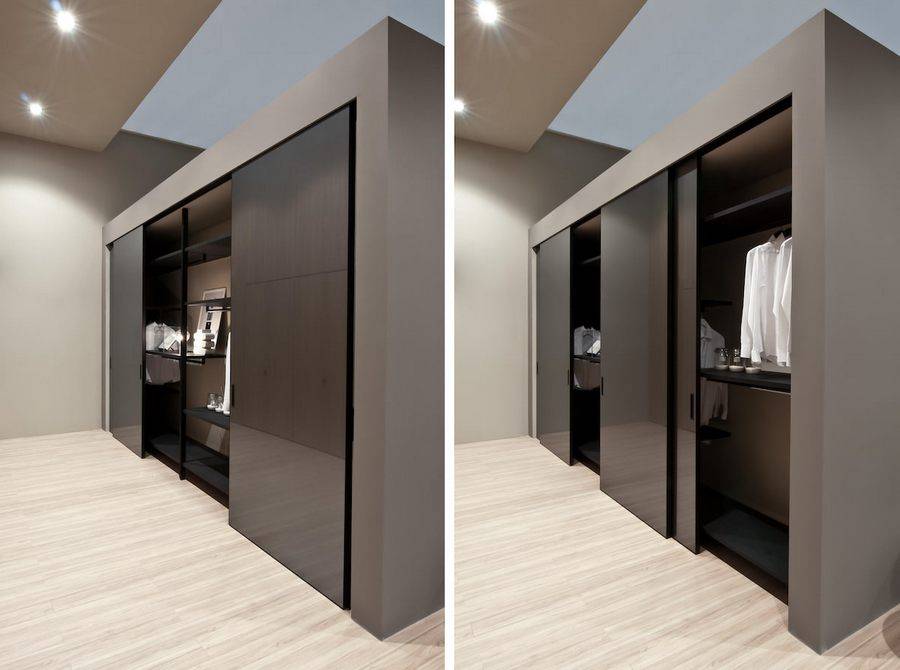 Встречаются встраиваемые шкафы скрытого типа. Они отличаются от других моделей дизайном дверей. Главная идея таких шкафов состоит в том, что двери не должны выделяться на фоне всего интерьера. Для этого им придают оттенок, напоминающий цвет стен, или же маскируют под окружающую обстановку с помощью декора, который повторяет отделку помещения.