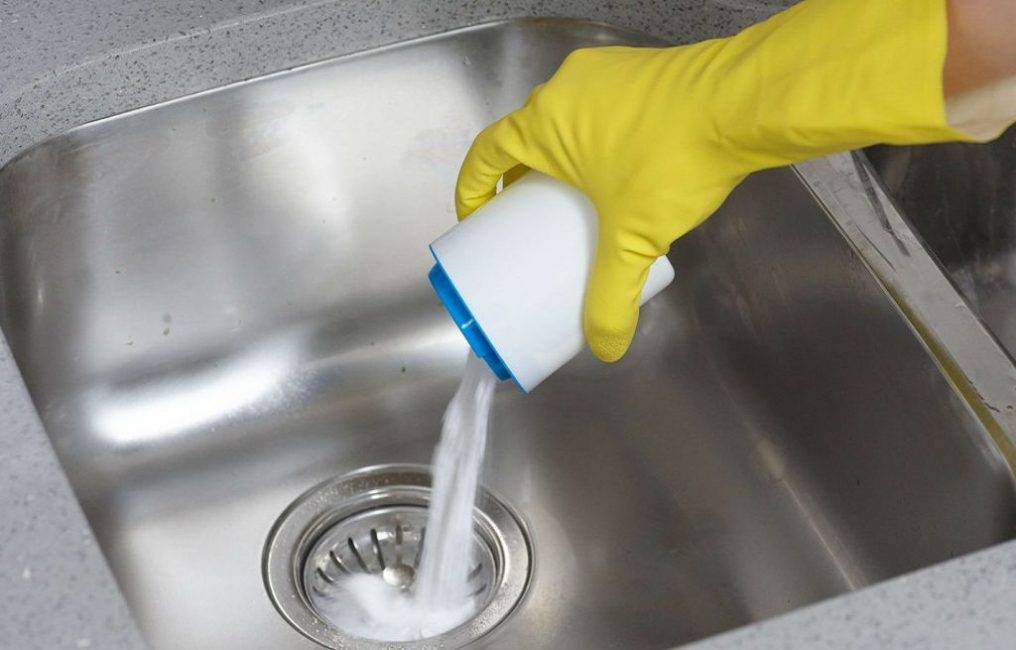 - Если выбранный препарат жидкий или гелеобразный, то отмеренную дозу препарата выливают в слив. В том случае, если препарат сухой, то его аккуратно высыпают в слив, после чего вслед за ним вливается 1-2 стакана воды.